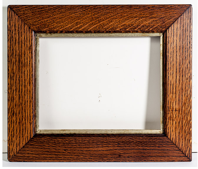 | A simple Arts & Craft, beautifully crafted, oak frame w/a tapering thin edge in excellent condition. It is 12 1/4 x 14 1/2 inches od. and has a 6 1/2 x 9 inch pic. size. #23-346, $140.00 | |