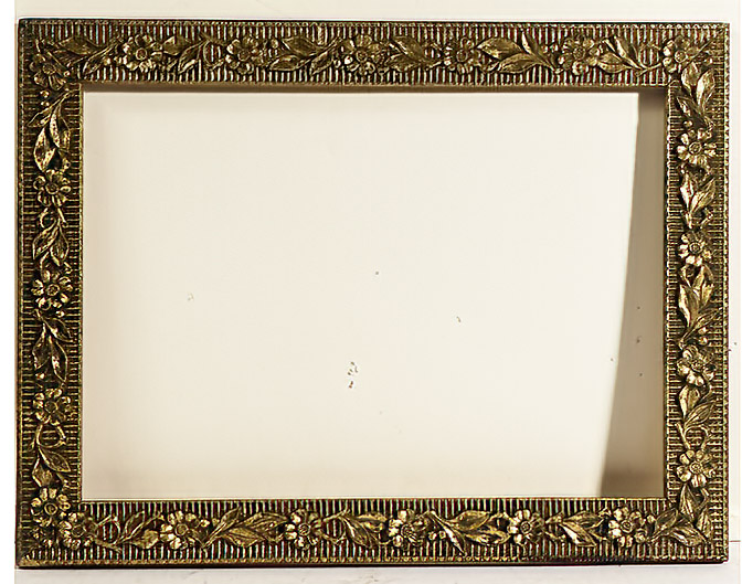 | A rare, elegant, Art Deco, high quality, carved brass frame ca.1935 in excellent condition. It originally held a Bachrach photograph. Bachrach is a famous photographer of the rich and famous. It is one of the oldest (founded 1868 in NYC) continuously operating photo studios in the world. Its velvet covered back piece is in excellent condition allowing you to mount it on the wall or tabletop. It is 10 1/2 x 13 1/2 inches od. and has a 10 x 13 inches pic. size. item #22-303, $130.00 | |